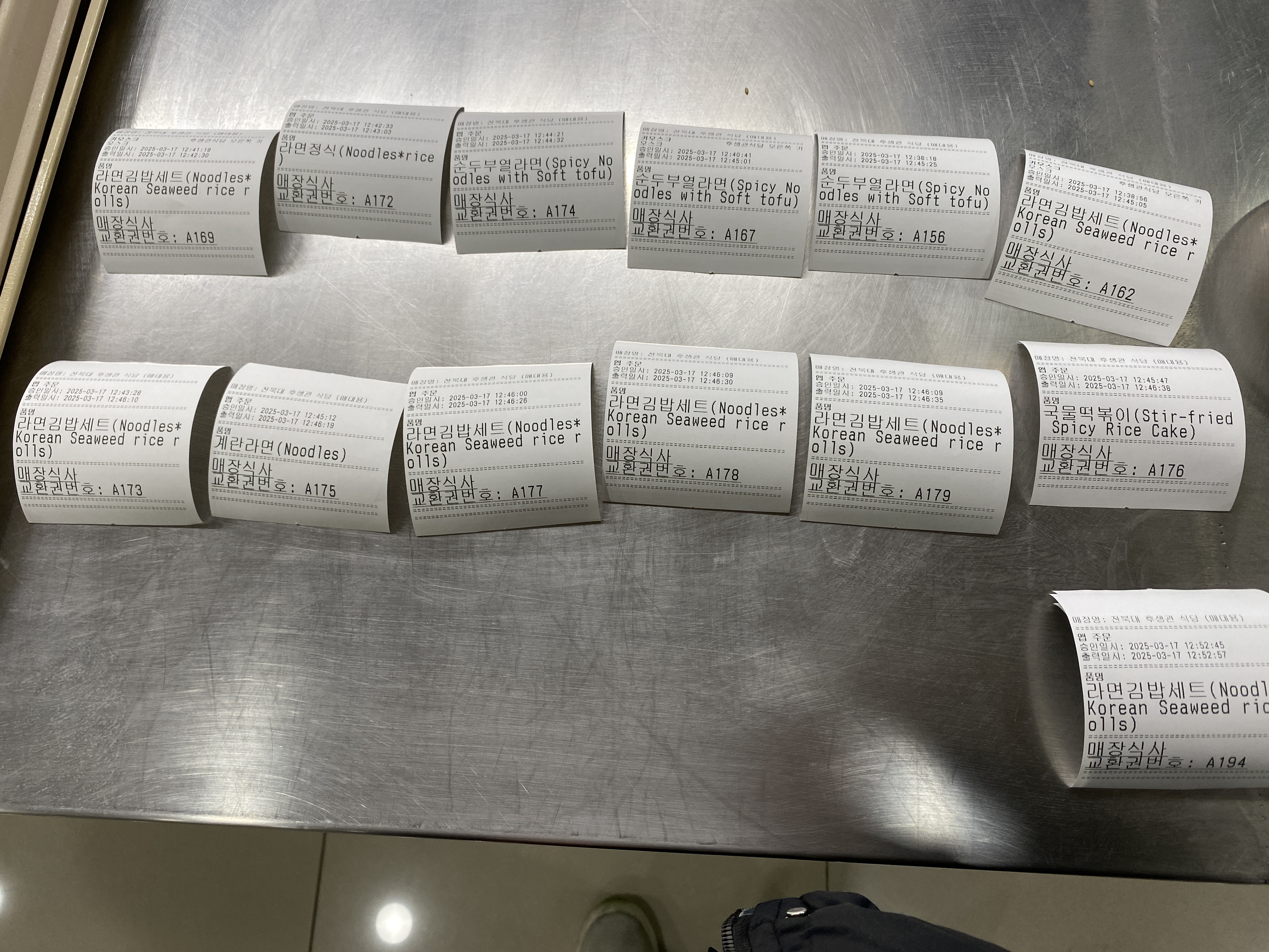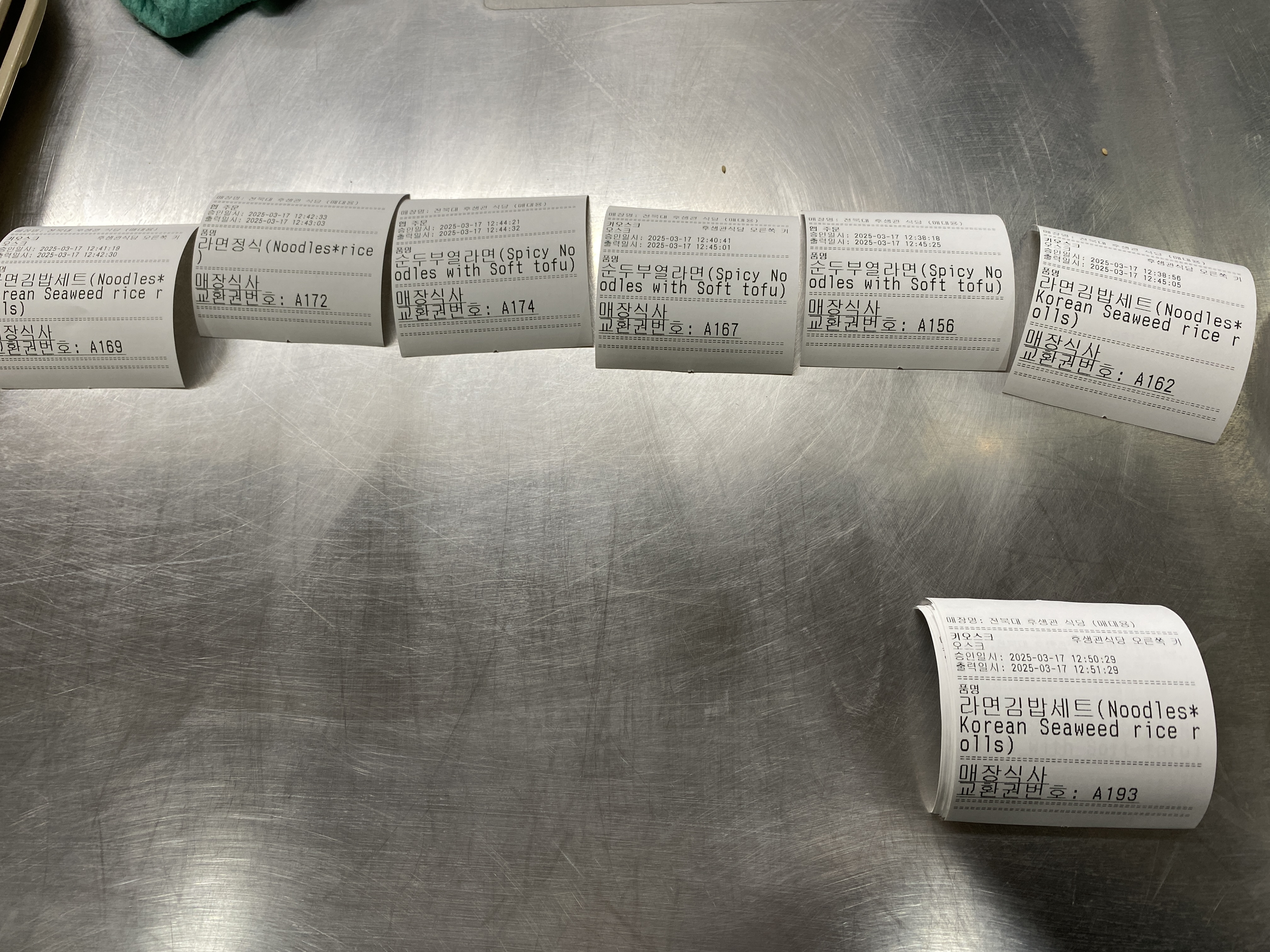 그런데 그분이 하시는 방식에 대해 들어 보니 그냥 교환권 찍고 줄 서시면 된다는 말을 주기적으로 하기만 하면 되겠다는 생각이 들었다. 그러면 테이블에 교환권을 한 줄에서 두 줄 정도만 나열하고 — 메뉴가 곧 빠질 것 같을 때 한 줄을 추가해서 총 두 줄을 만든다. — 나머지는 하나로 쌓아 둔 뒤 그것에 공기밥이나 삶은 계란 교환권이 바로 뒤에 달려 있는지는 않는지, 짜계치/떡볶이가 있는지는 않은지를 살펴 <신라면 혹은 열라면 5~6개 + 짜계치 혹은 떡볶이 2개> 한 줄을 여유롭게 만들 수 있다. 라면김밥세트나 라면정식이 있는 경우 최대한 미리 김밥과 밥 재고를 마련해 두어 밀리지 않게 한다. 그 예는 아래 사진을 참고하면 된다.