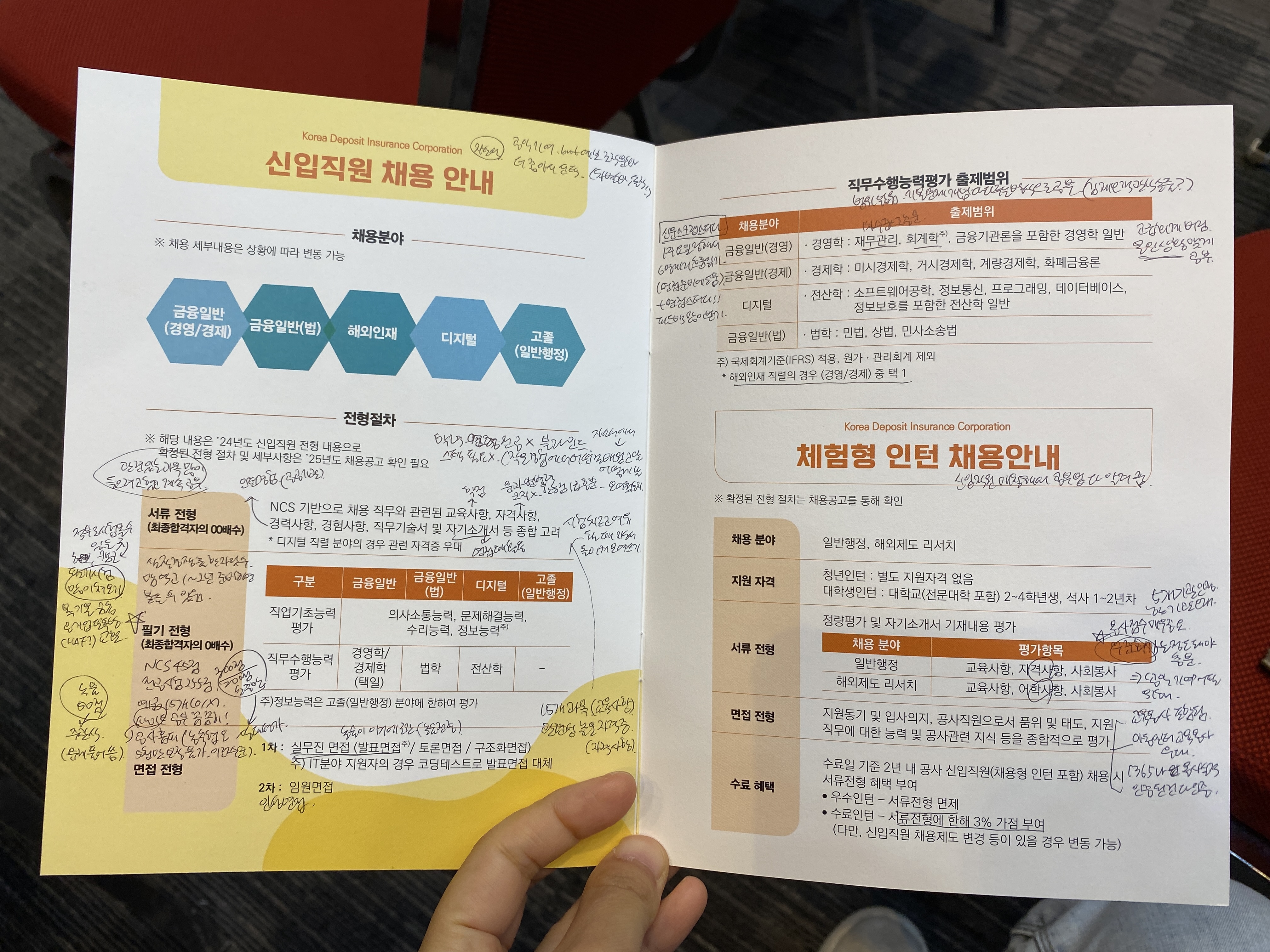 어떤 활동 및 경험이든 기본적으로 내가 훗날 찾아보기 위해 기록하는 경향이 있는데, 이번 예금보험공사 채용설명회 후기는 정말 100% 미래의 나를 위해 작성하게 될 것 같다. 이 프로그램을 신청하고 진수당에 도착할 때까지만 해도 글을 올릴 생각이 전혀 없었는데, 설명회를 들으면 들을수록 ‘저기서 일해 보고 싶은데?’라는 생각이 강하게 들어서 혹시 몰라 중요 화면 사진을 찍는 것에서 그치지 않고 받은 팜플렛에 열심히 차장님과 신입사원님께서 말씀하시는 내용을 받아 적었다.